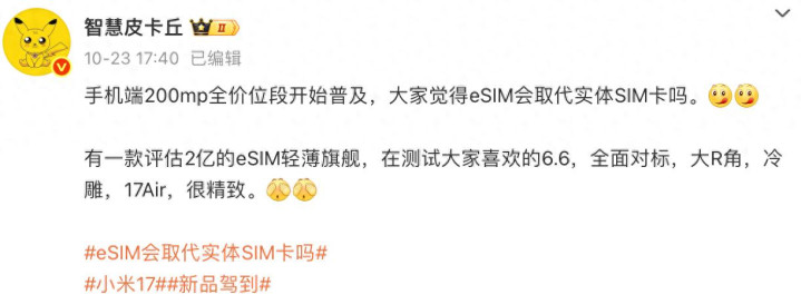 我个人认为,小米 17 系列大概率没有 Air 版,而曝光的 eSIM 机型预计是 Civi 6 系列,毕竟今年上半年发布的 Civi 5 系列表现并不理想,另外有不少爆料称,小米 Civi 系列将会走轻薄路线。